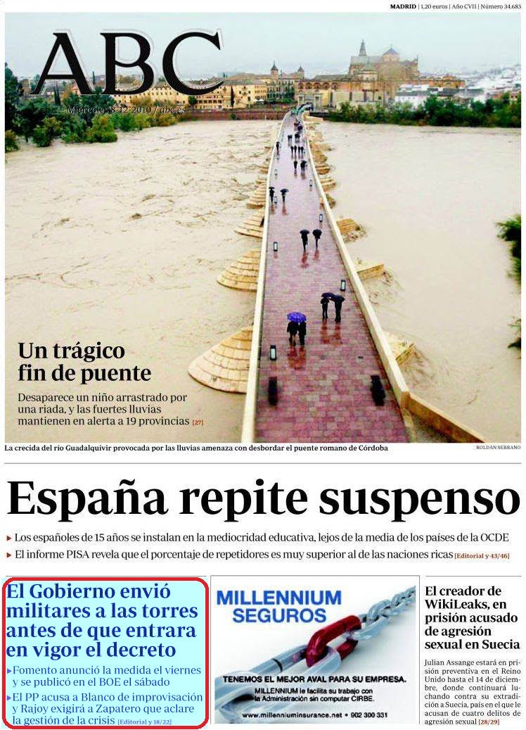 O puede ser, sencillamente que, como apunta Ignacio Camacho, Zapatero sea ya sólo el presidente nominal, mientras el efectivo sea ya Rubalcaba, verdadero comandante en jefe de esta operación de arrasar al enemigo y adulterar la realidad, en las que es especialista. Aunque tampoco haya estado muy fino esta vez. «El Gobierno sabía que eran posibles conflictos agudizados hasta navidades, dado que los controladores ya habían superado el límite anual de horas de trabajo», declaró a una emisora de radio. Si el Gobierno sabía de la posibilidad de esos conflictos con los controladores, ¿por qué decretó la rebaja de sus sueldos y el aumento de sus horas de trabajo justo cuando cientos de miles de españoles se disponían a volar? Si no fue para crear tal caos en los aeropuertos que pudiera justificar darles en la cabeza con el estado de alarma, fue una falta de previsión monumental. Y casi más grave es que se les obligara a trabajar habiendo sobrepasado su límite de horas de trabajo, cuando éste requiere un máximo de atención y plena forma física. Claro que esos son detalles que parecen importar poco al presidente y su válido.